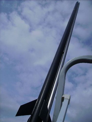 Nach Hermann`s Clusterrakete konnten wir noch Martin`s Mean Machine mit einem Aerotech E21 Motor starten sehen ...