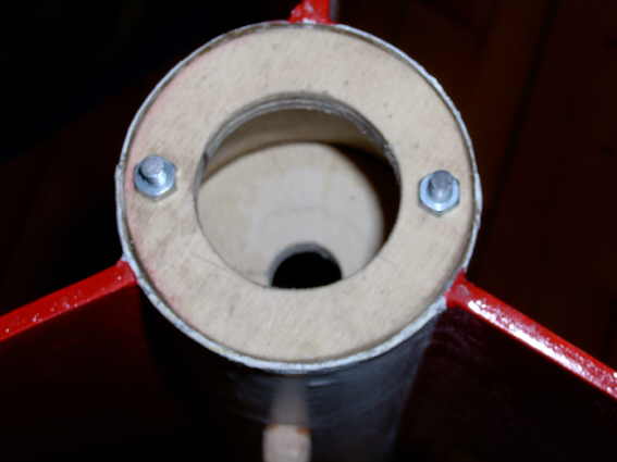 Die neue Motorhalterung. Nachdem ich immer wieder hörte das sich der ROS beim Abbrand etwas erweitert und dann nur noch schlecht aus dem Motorrohr heraus zu bekommen sei hab ich einfach zwei Pappelsperrholzspanten als Motorhalter verwendet, das Motorrohr fällt dabei einfach weg.